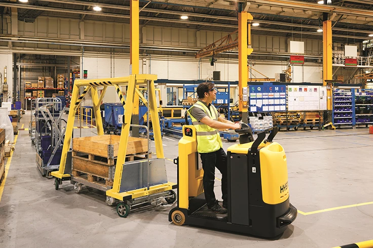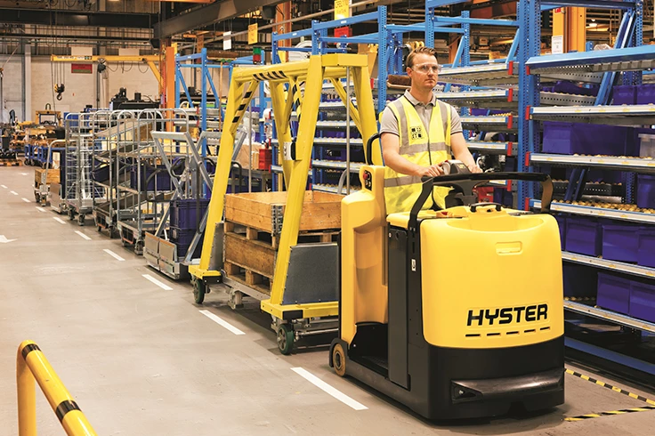 The Hyster® tow tractor helps manufacturing operations transport material to production lines and is ideal for the automotive and engineering industries and for any type of line feed operation.