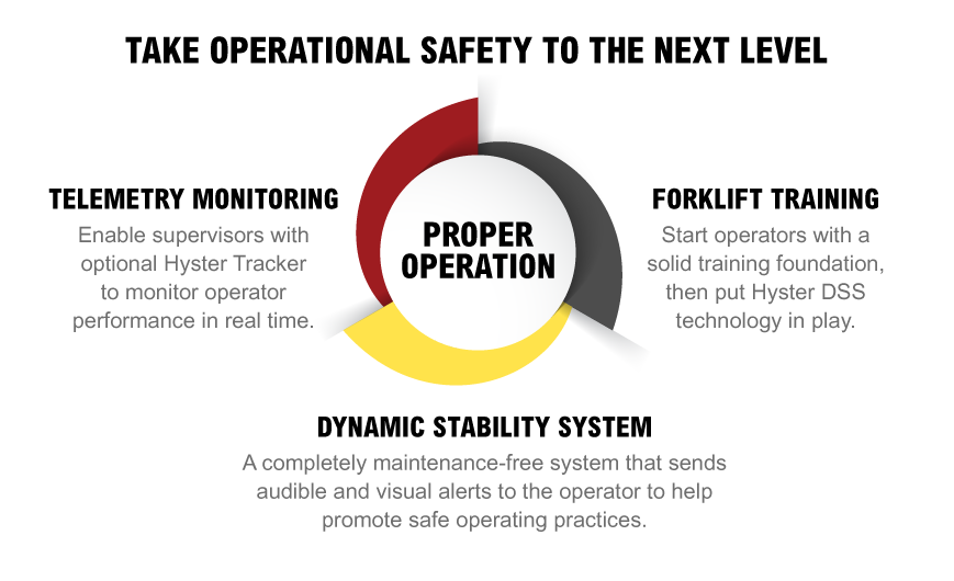 Forklift safety is critical in the materials handling industry. That’s why we’ve engineered the Hyster® Dynamic Stability System (DSS) into every A Series model. The innovative system helps support confidence and promote safe operating practices for forklift operators. Click through each aspect to learn more.