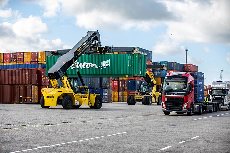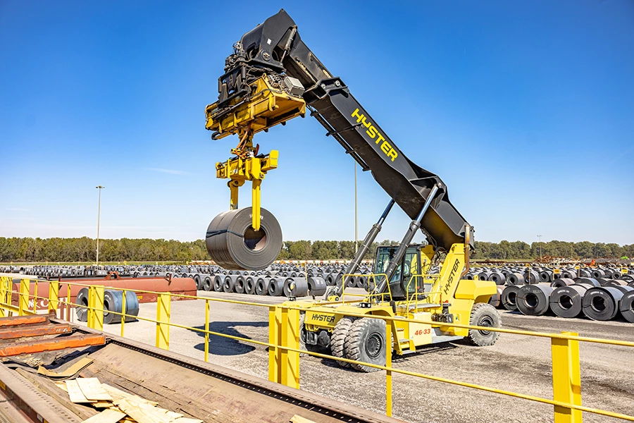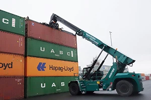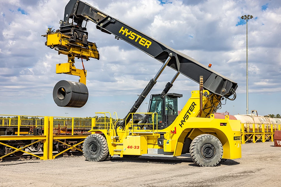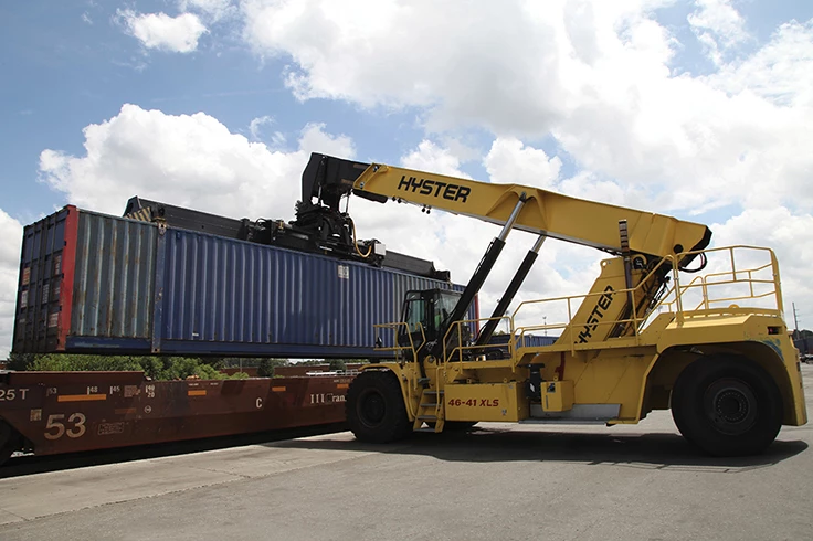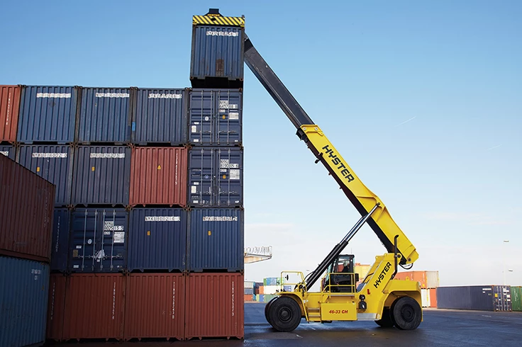 Novateur, le ReachStacker Hyster® est proposé dans une large gamme de configurations et peut être doté de nombreuses options. Il offre une flexibilité jamais égalée pour exécuter de nombreuses tâches différentes, notamment la manutention en 2e rail, le déchargement de conteneurs, la manutention de pales et de tours d'éoliennes, la manutention d'acier et la manutention sur barges.