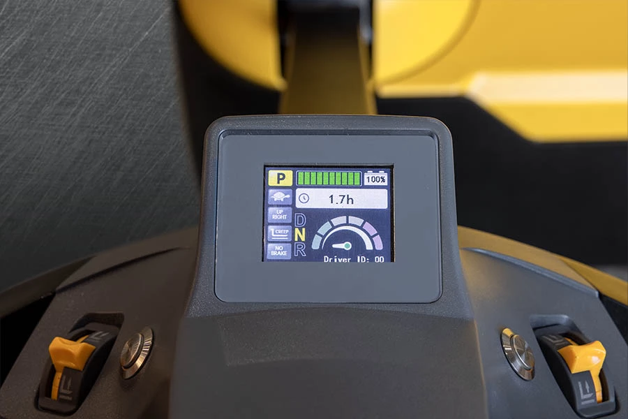 La poignée multifonction du timon est centrée de manière ergonomique, de sorte qu'il est possible d'actionner toutes les fonctions de déplacement ou de levage de n'importe quelle main. Un afficheur intelligent placé sur la poignée fournit des informations à l'opérateur de manière pratique.