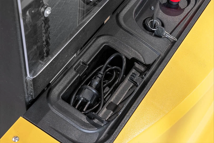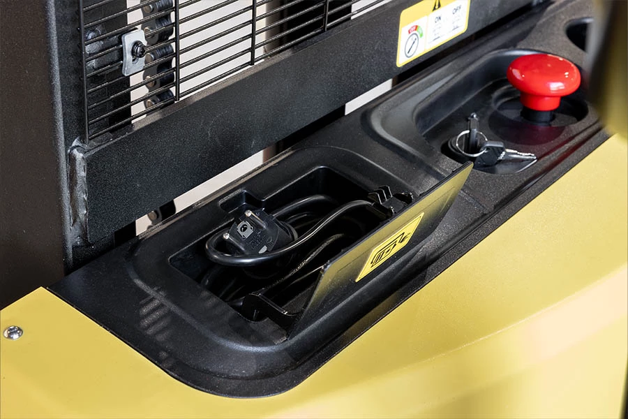 Les responsables Hygiène et Sécurité peuvent également avoir l'esprit tranquille. Ce gerbeur est équipé d'un chargeur intégré et s'éteint pendant la charge, ce qui permet d'atténuer les risques. De plus, sa faible garde au sol de 30 mm contribue à réduire le risque de blessures aux pieds.