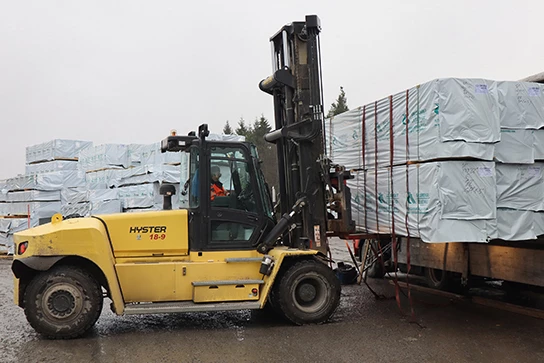 - Le positionnement des fourches simultané aide à stabiliser les charges en vrac.